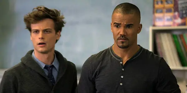 Reid i Morgan patrzą na coś poza ekranem z szokiem na twarzach w karnych umysłach