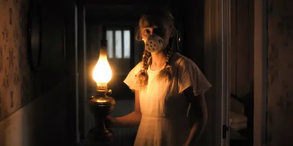 Amiah Miller jako Rose, wyglądając na obawiającą się podczas noszenia maski i trzymania latarni w wstrzymaniu oddechu