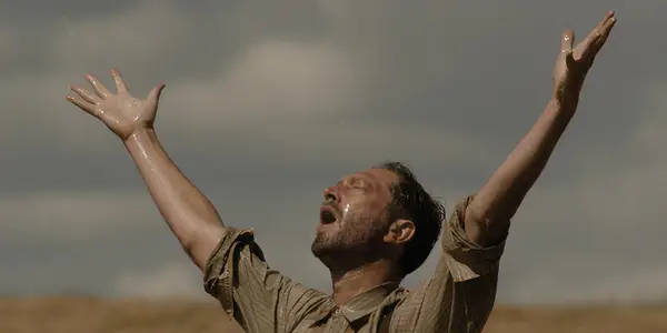 Ebon Moss-Bacharach jak Wallace z otwartymi ustami, oczami zamkniętymi i ramionami uniesionymi w kierunku nieba w ulewy wstrzymania oddechu