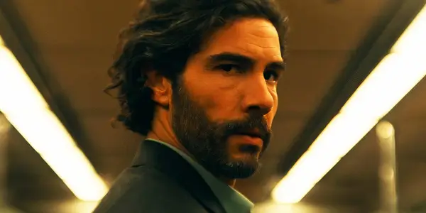 Tahar Rahim jako Ezechiel Sims w swoim czarno -czerwonym garniturze w Madam Web